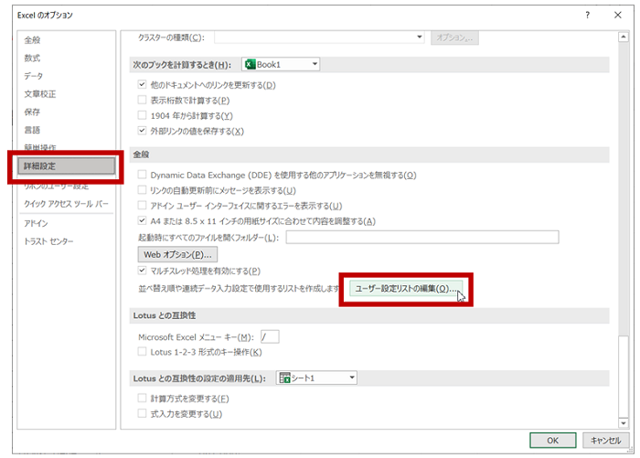 [Excel のオプション] ダイアログ ボックスの [詳細設定] をクリックします。 (一番下までスクロールして) [ユーザー設定リストの編集] をクリックします。