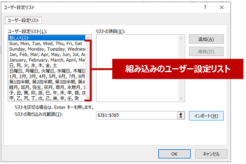 あらかじめ Excel に組み込まれているリストには、「1月」 ~ 「12月」や「第1四半期」 ~ 「第4四半期」、「日曜日」 ~ 「土曜日」などがあります。