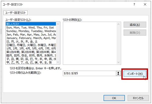 [ユーザー設定リスト] ダイアログ ボックスの [リストの取り込み元範囲] ボックスに、あらかじめ選択していたセル範囲が指定されています。