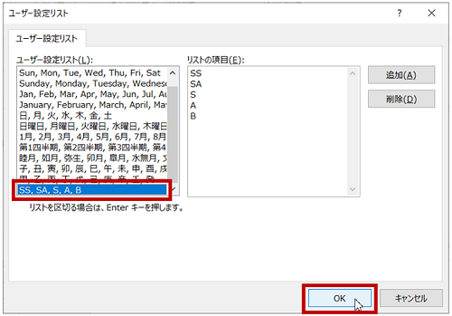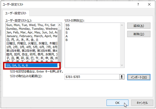 ユーザー設定リストの追加に使用したセル範囲の文字列は消します。(消してしまっても問題ありません。という意味)