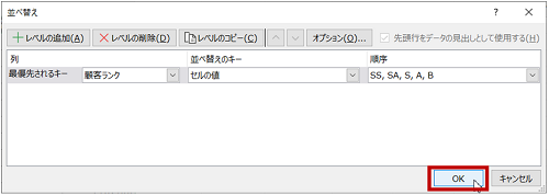 組織的なルールでは「SS」が一番高く、「B」が一番低いランクだとしても、そんなことを Excel は知らないので、アルファベットの降順で並べ替えられます。