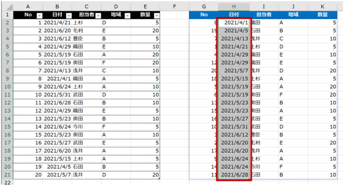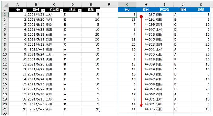 このとき、対象データの範囲には [No] や [日付] などの見出し部分のセルを含めません。含めた場合、見出しもデータと同等に扱われて並べ替えの結果に含まれます。
