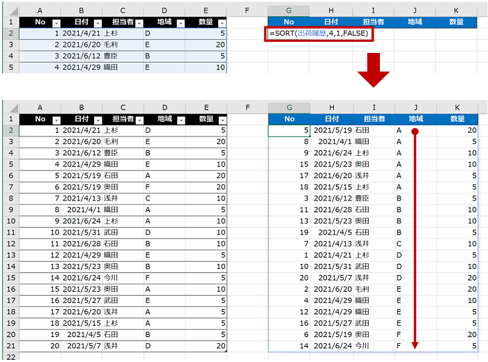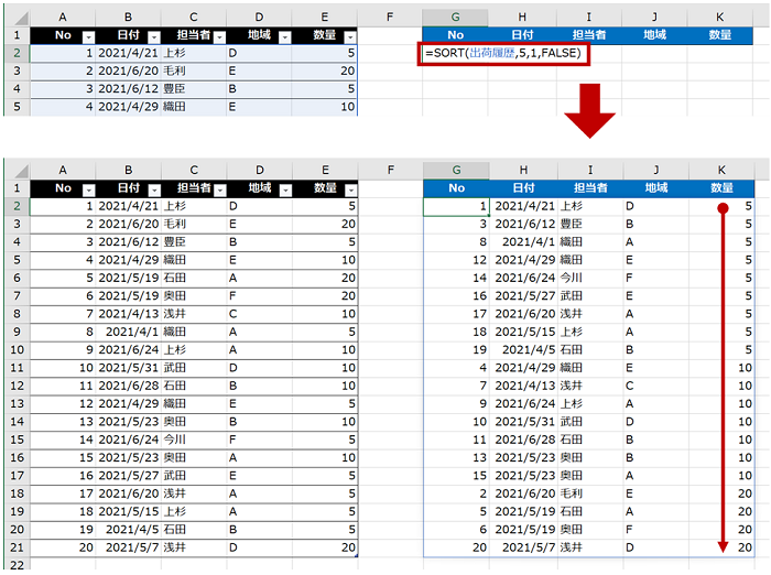 =SORT(SORT(出荷履歴,5,-1,FALSE),2,1,FALSE)