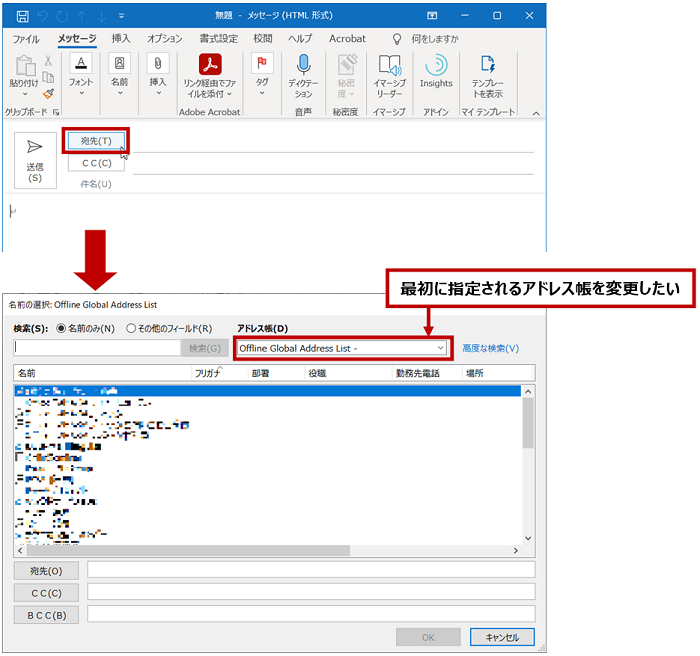 [名前の選択] ダイアログ ボックスの右上の [アドレス帳] に、「Offline Global Address List」や「グローバル アドレス一覧」が指定されていると、自分の Outlook の [連絡先] フォルダーではなく、組織内のユーザーの一覧が表示されます。