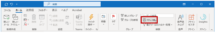 メールの作成画面ではなく、Outlook のメイン ウィンドウの [ホーム] タブの [検索] グループの [アドレス帳] をクリックします。