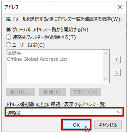 [アドレス] ダイアログ ボックスの [アドレス帳を開いたときに最初に表示するアドレス一覧] で「連絡先」を選択し、[OK] をクリックします。
