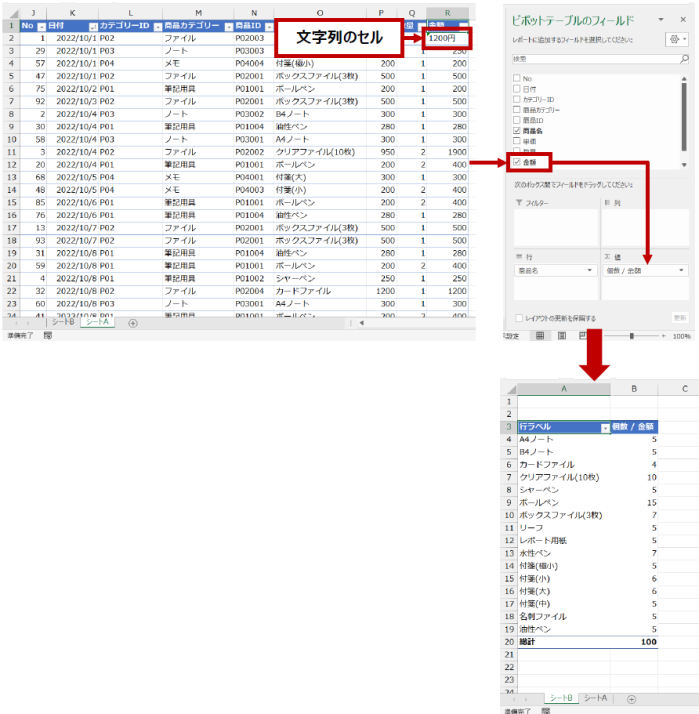 ただし、文字列が混ざっているからといって、その他の数値の合計を集計できないわけではないので、集計方法の変更について次にご紹介します。