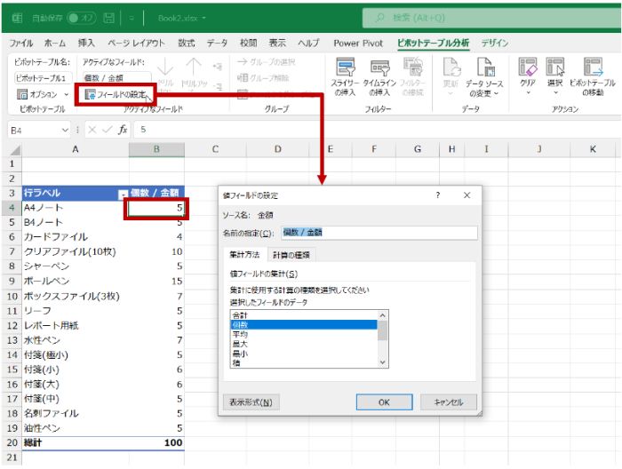 個数が算出されている値フィールドを選択し、[値フィールドの設定ダイアログ ボックス] を表示します。