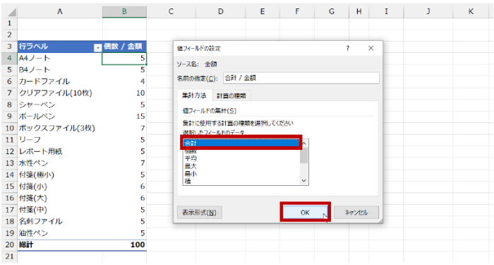 [集計方法] タブの [値フィールドの集計] で [合計] を選択して [OK] をクリックします。