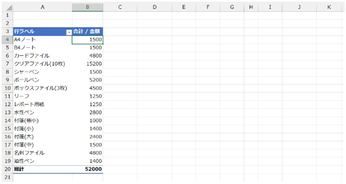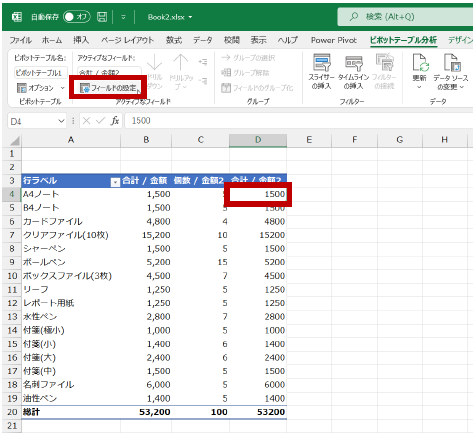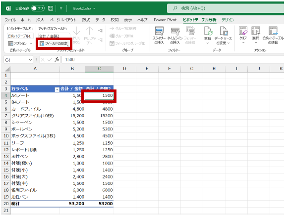 たとえば下図の A4ノート の 1,500 円という合計値は、総計の 53,200 円の何パーセントなのかを算出したい、ということです。