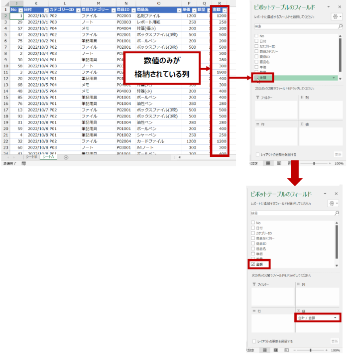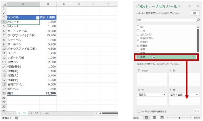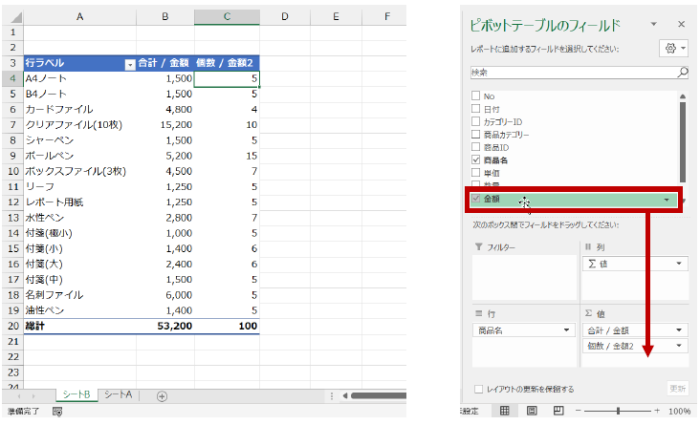 [金額] 列の名前を [値] エリアにドラッグして、2 つ目の値フィールドを作成します。(個数がわかればよいので、[金額] 列でなくてもよいですが、ここではあえて同じ列を元にしています。)
