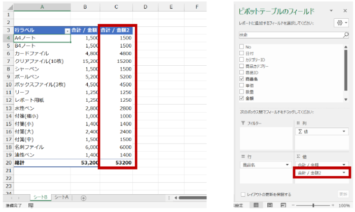 [値] エリアに 2 つ目の値フィールドが作成され、合計値が算出されます。