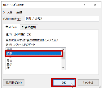 [集計方法] タブの [値フィールドの集計] で [個数] を選択して [OK] をクリックします。