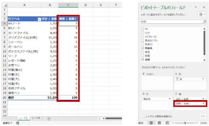 選択している値フィールドの集計方法が個数に変更されます。集計方法の変更に合わせてフィールド名も [個数 / 金額2] に変更されます。