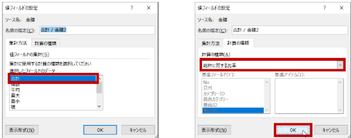 [集計方法] タブで [合計] が指定されていることを確認し、[計算の種類] タブで [総計に対する比率] を選択して [OK] をクリックします。
