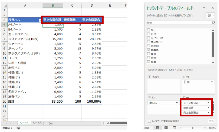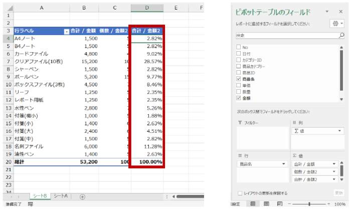 [値] エリアに、[金額] 列をもとにした 3 つ目の値フィールドを作成して合計を算出し、さらに「総計に対する比率」を追加して割合を求めます。