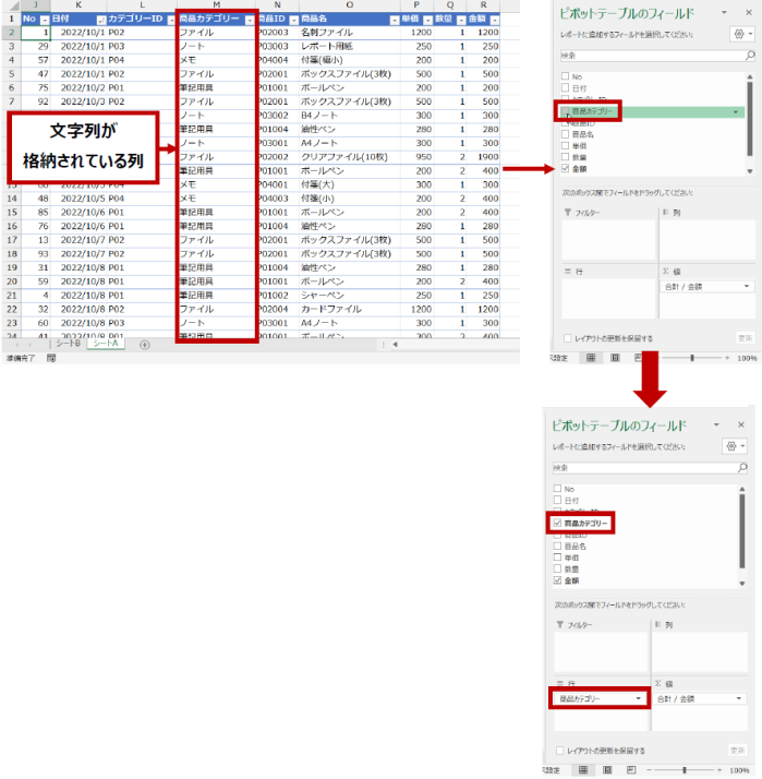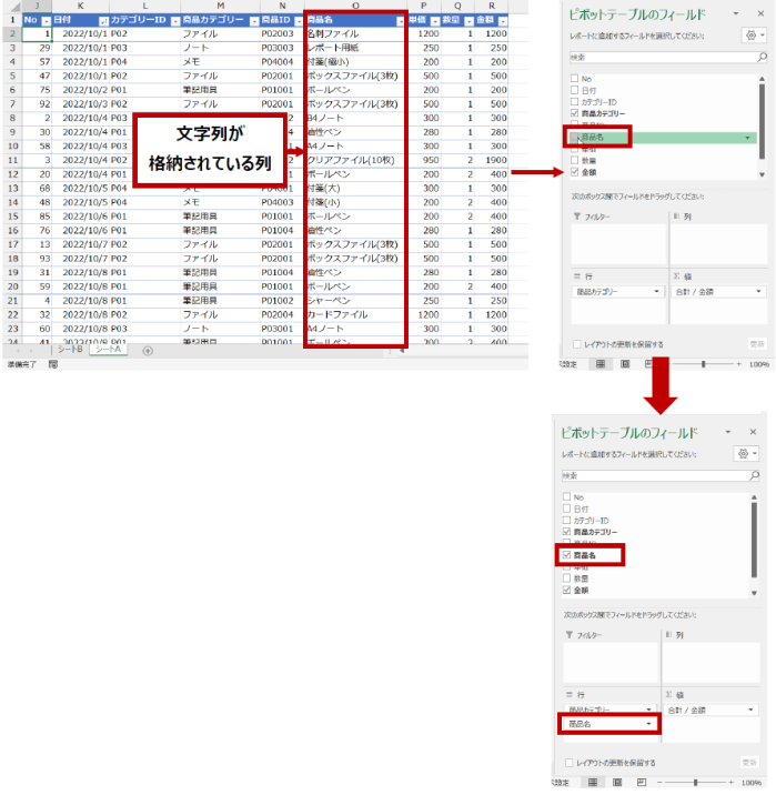 データ ソースの列に文字列データや日付データが 1 つでも含まれている場合は [行] エリアにピボットテーブル フィールドが作成されます。