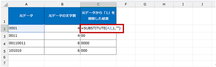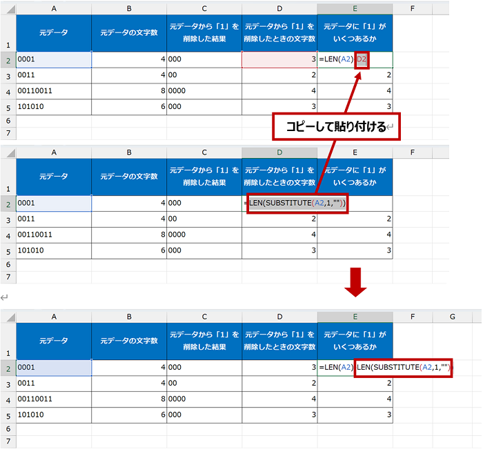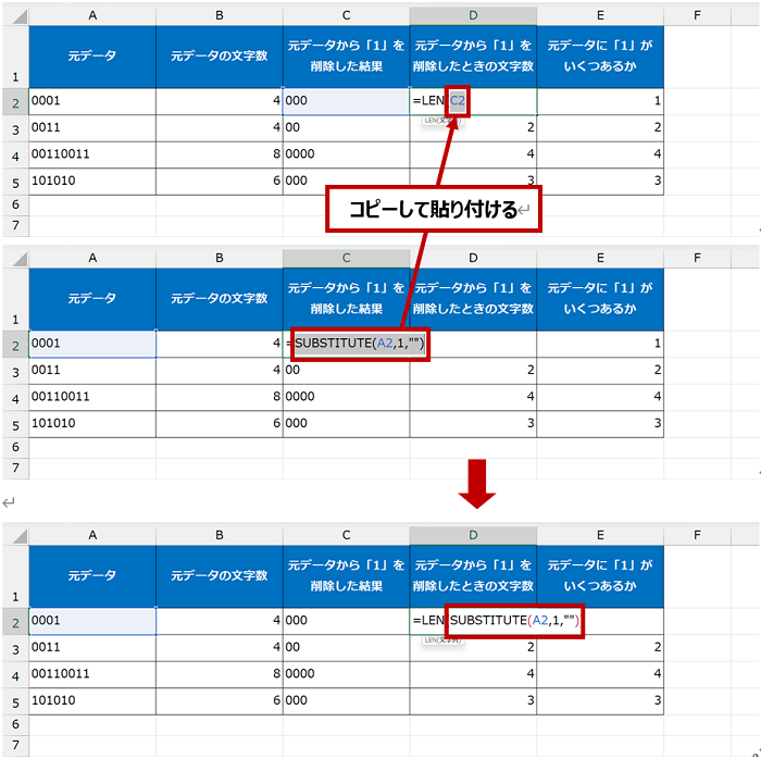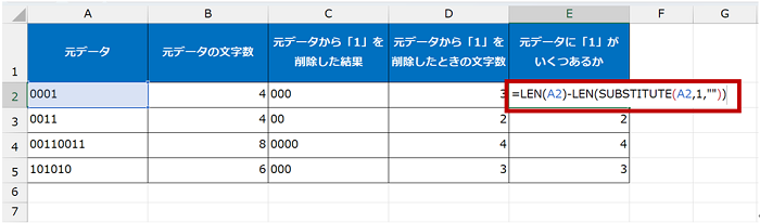 簡単にまとめると、元データの文字数から、元データの「1」を削除したときの文字数を引き算して対応できます。