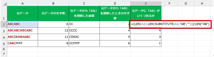 「ABCABC」の「AB」の数を知りたいときに「1」のときと同じ処理をすると「4」が返りますが、知りたいのは「何セットか」なので「AB」の文字数である 2 で割らないといけません。最初の引き算を先にするための括弧も忘れずに。