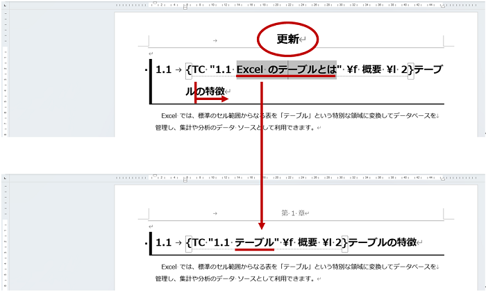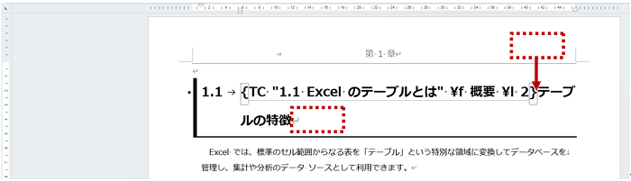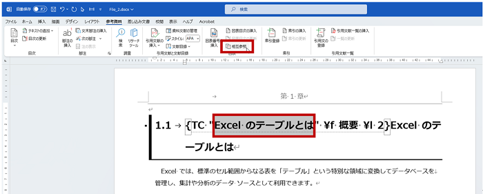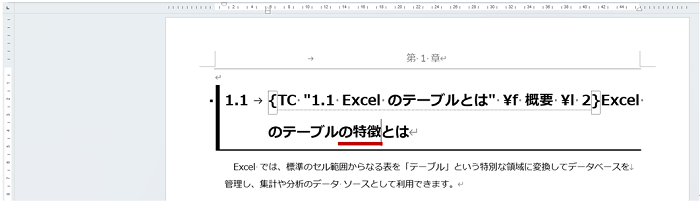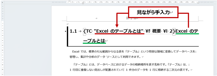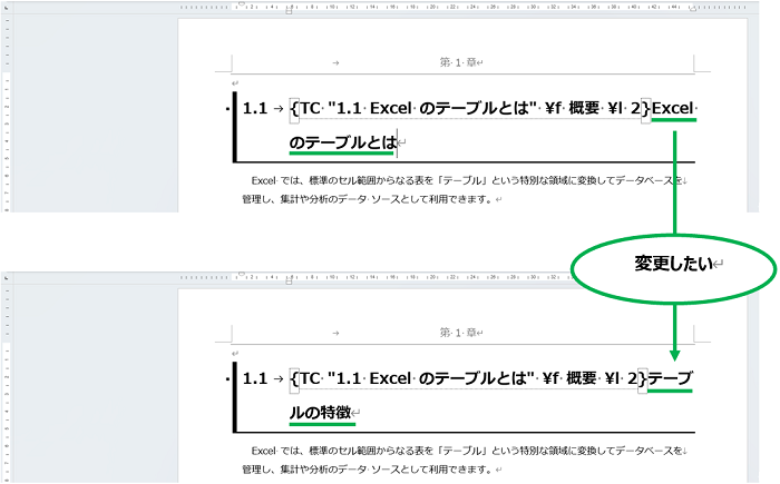 下図の緑の下線部分、つまり見出しの内容となる文字列を変更し、相互参照で挿入した段落の内容を更新すれば最新の状態を TC フィールドの中にも反映できます。