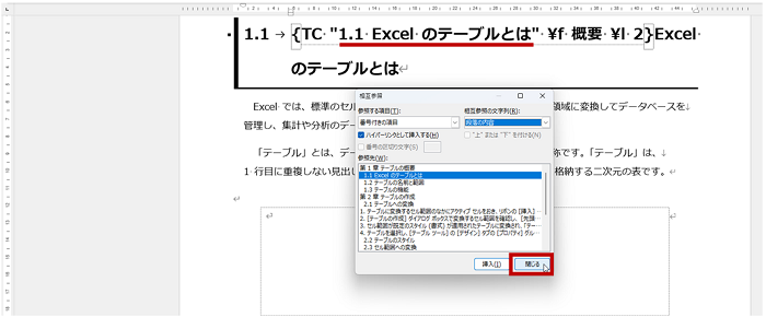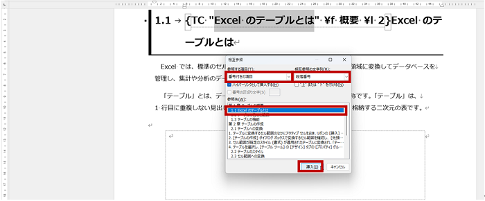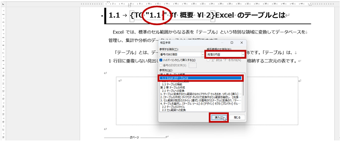 挿入された段落番号 (1.1) の後ろに半角スペースを入力してカーソルをおき、[相互参照の文字列] で [段落の内容] を指定して、該当の参照先 (ここでは、1.1 Excel のテーブルとは) を選択して [挿入] をクリックします。