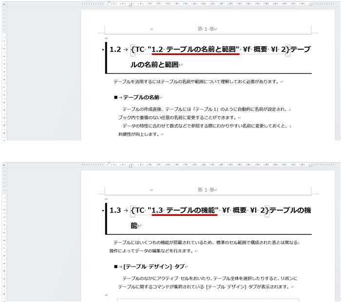 ここでは、TC フィールドを使って章扉に作成した目次に、「1.1」などのアウトライン番号も表示し、見出しの内容が変更されたときに手入力で編集しなくてよいようにします。