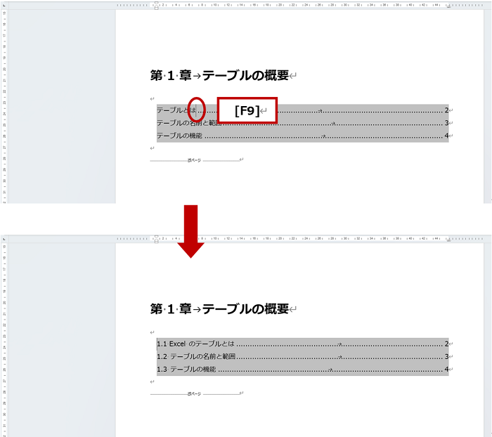 - 目次をクリックしてカーソルをおいて、日本語入力をオフにして [F9] を実行します。
