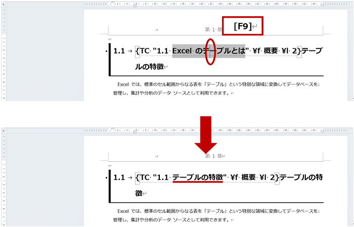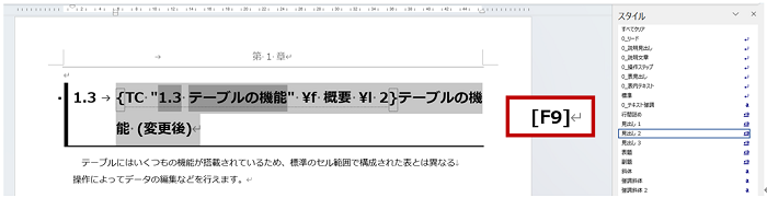 見出しに設定した TC フィールドの文字列をクリックしてカーソルをおいて、日本語入力をオフにして [F9] を実行します。