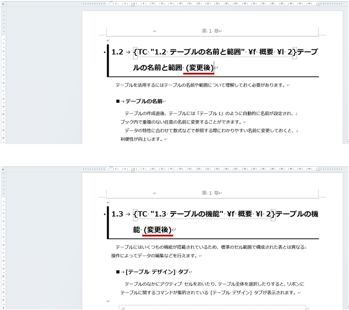 下図では、1.2 の見出しと、1.3 の見出しの文字列を変更しています。