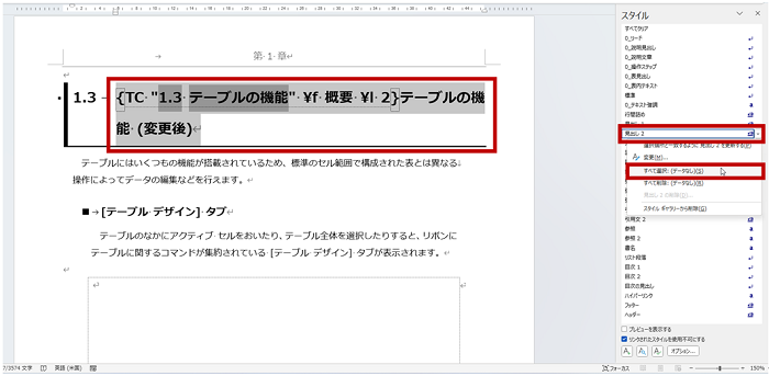- フィールドを更新したい見出しの段落を選択して、[スタイル] ウィンドウで選択されているスタイル (ここでは 「見出し 2」) を右クリックして、[すべて選択] をクリックします。