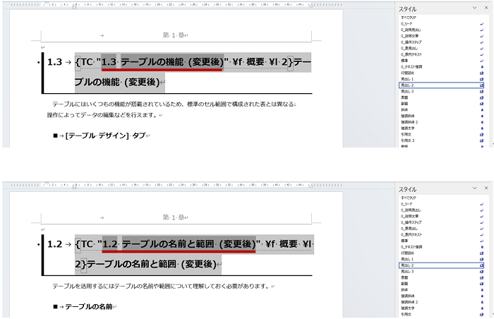- 選択していたすべての段落 (= 「見出し 2」が適用されている段落) のフィールドが更新されます。
