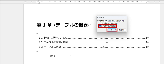 - [目次の更新] ダイアログ ボックスで [目次をすべて更新する] をオンにして [OK] をクリックします。