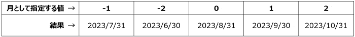 たとえば、開始日が 2023/8/15 だった場合、月 に -1 から 2 を指定した場合の違いは次の通りです。