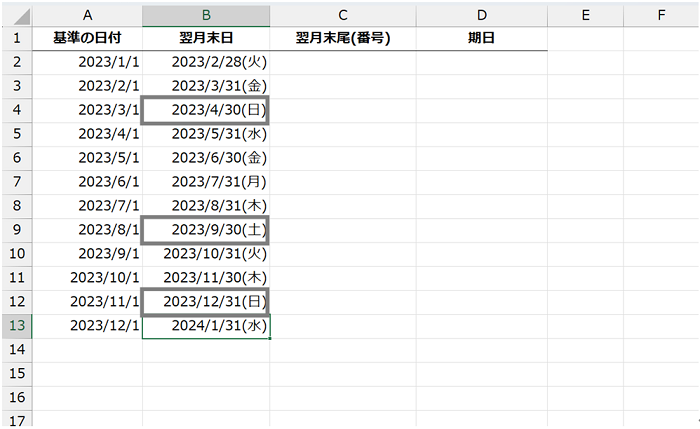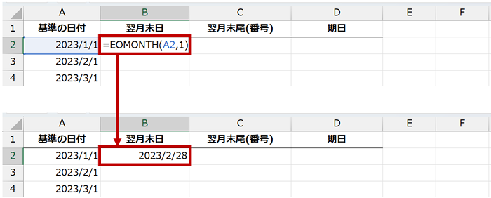下図では、A 列の日付の翌月末日を B 列に返す数式を作成しています。