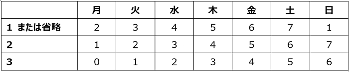 [週の基準] に「1」「2」「3」を指定した場合の違いは次の通りです。
