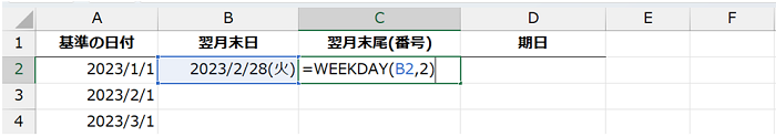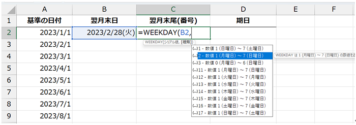 下図では、B 列の日付の曜日を C 列に返す数式を作成しています。[週の種類] は「2」としています。