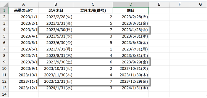 B 列の日付が土日だった場合は前の金曜日の日付が返っていることがわかります。