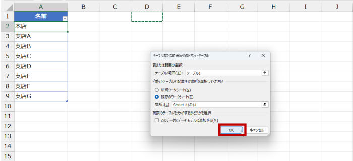 - シート名としたい項目だけをテーブルにまとめて、このテーブルをデータソースとしてピボットテーブルを作ります。あとで消してしまうピボットテーブルなので作成場所は新規ワークシートでも既存のワークシートでもよいです。