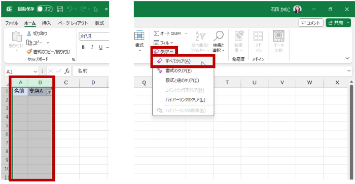 - 不要なピボットテーブル (と、それが含まれる列) を削除するため、ピボットテーブルを含む列を選択して、リボンの [ホーム] タブの [編集] グループの [クリア] - [すべてクリア] を実行します。