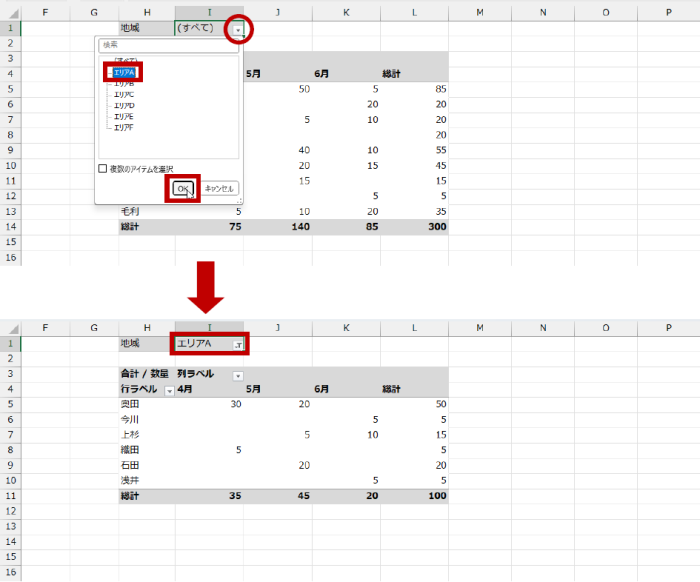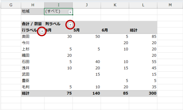 ピボットテーブルの [行] エリアや [列] エリアにフィルター機能があって、アイテム (項目) を条件として選択して集計結果をフィルターできます。
