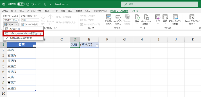 - ピボットテーブル内にアクティブ セルをおいて、リボンの [ピボットテーブル分析] タブの [ピボットテーブル] グループの [オプション] の ▼ をクリックして、[レポート フィルター ページの表示] をクリックします。