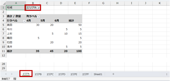 「このシートではエリアA」の集計結果を確認したいけど、こっちのシートではエリアBを見たい」というときには、ピボットテーブルの作成後に自分でワークシートをコピーして [フィルター] エリアの条件を指定します。