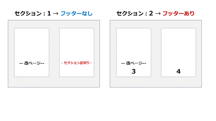 セクションが分かれていれば、セクションごとにフッターの要 / 不要やページ設定を決定できます。
