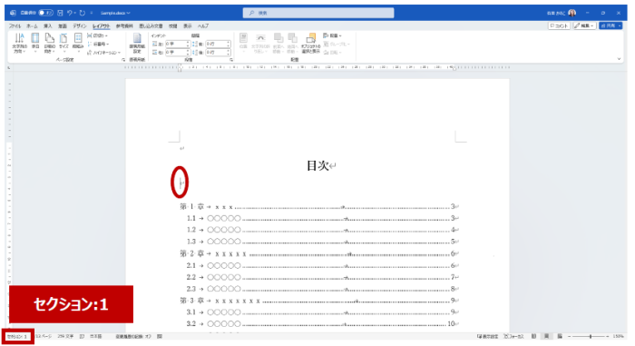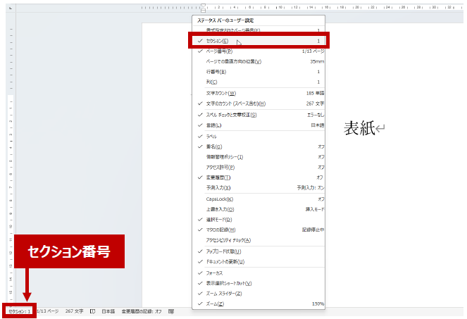 セクション番号が表示されていない場合は、ステータス バーを右クリックして [セクション] のチェックをオンにしてください。