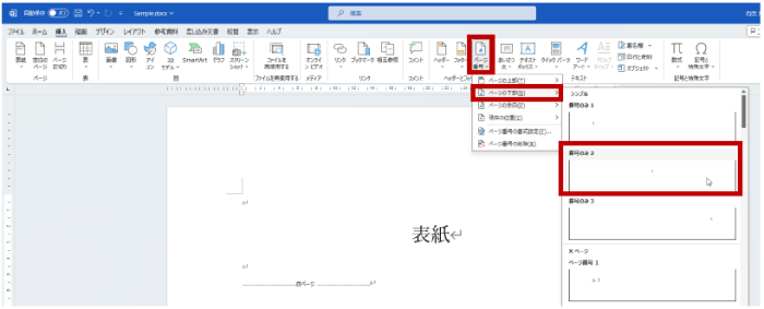 1.(カーソルはどこにあってもよいので) リボンの [挿入] タブの [ヘッダーとフッター] グループの [ページ番号] をクリックし、[ページの下部] - [番号のみ 2] をクリックします。