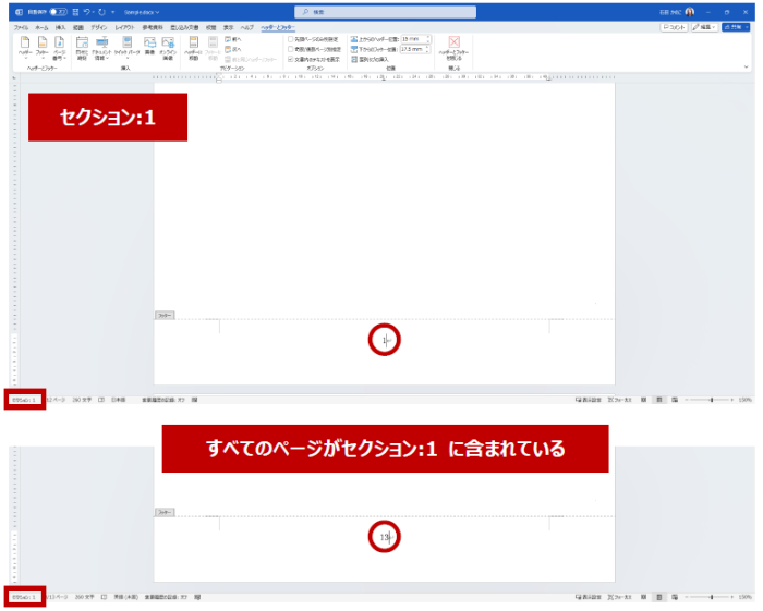 文字数が増えて自動的にページが追加されたり、改ページを挿入して強制的にページを増やしたりしたとき、これらはすべてセクション 1 の中に含まれます。