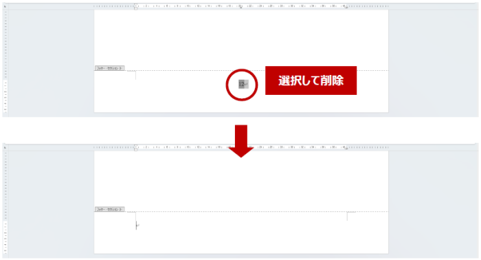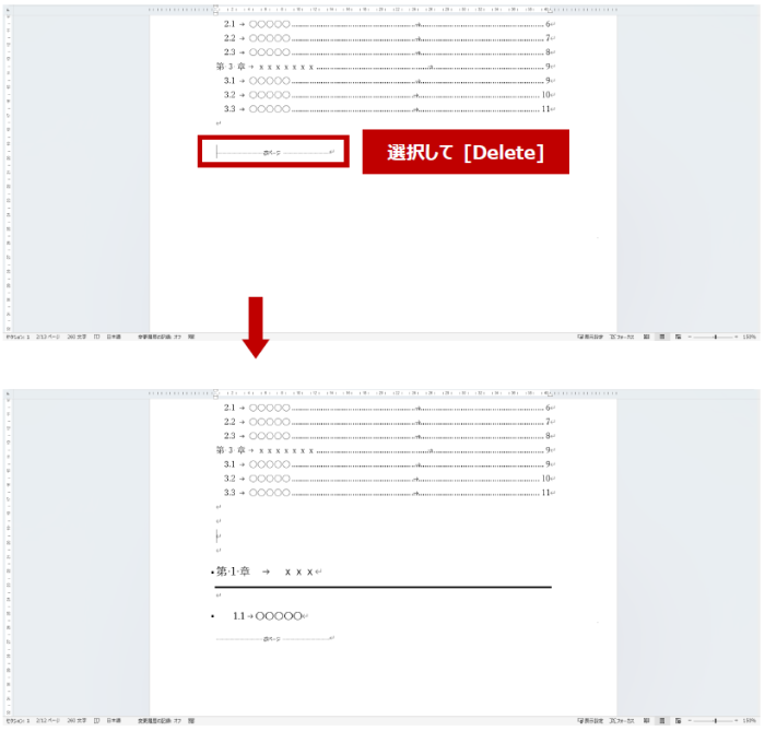 - セクション:1 (表紙または目次) のフッター領域にあるページ番号を選択して [Delete] などで削除します。