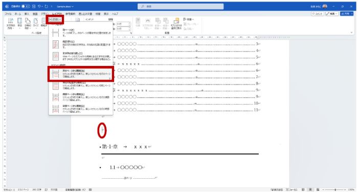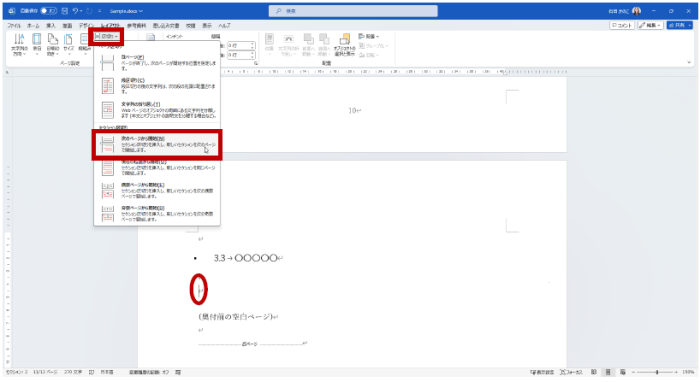 なお、作業しているファイルに現在改ページは入っていない、という場合は、セクションを分けたいと考えているページの末尾にカーソルをおいて手順の 2. から操作し、セクション区切りを挿入してください。