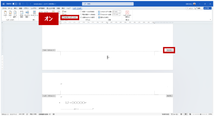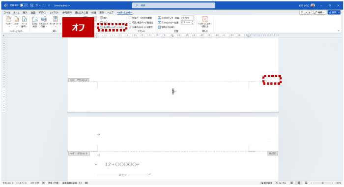 - セクション:3 のフッターを選択して、リボンの [ヘッダーとフッター] タブの [ナビゲーション] グループの [前と同じヘッダー/フッター] をオフにします。