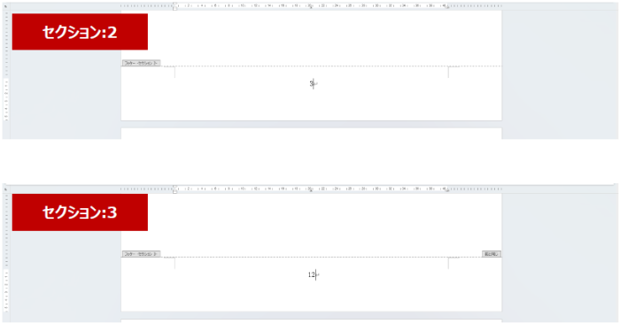 1 ~ 2 ページにカーソルをおくと、ステータス バーに「セクション:1」と表示され、3 ページ以降にカーソルをおくと「セクション:2」と表示されていることがわかります。